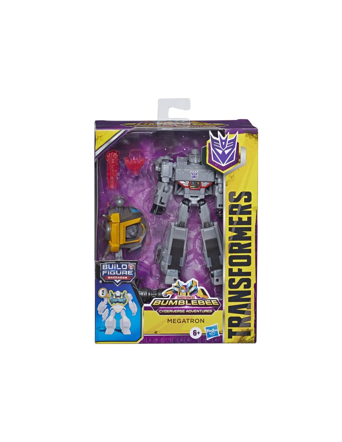 Tamaño figura: 12,5cm. Tamaño: 6,3x23,8x15,2cm. Incluye: figura, vehículo, 2 accesorios, pieza de figura para armar e instrucciones. Transformers de conversión fácil para niños a partir de 6 años. Convierte a Megatron de robot a tanque en 23 pasos. Cada figura clase de lujo viene con una pieza de figura para armar. Combina todas las piezas para armar una figura de Maccadam, ¡el amado personaje del programa!