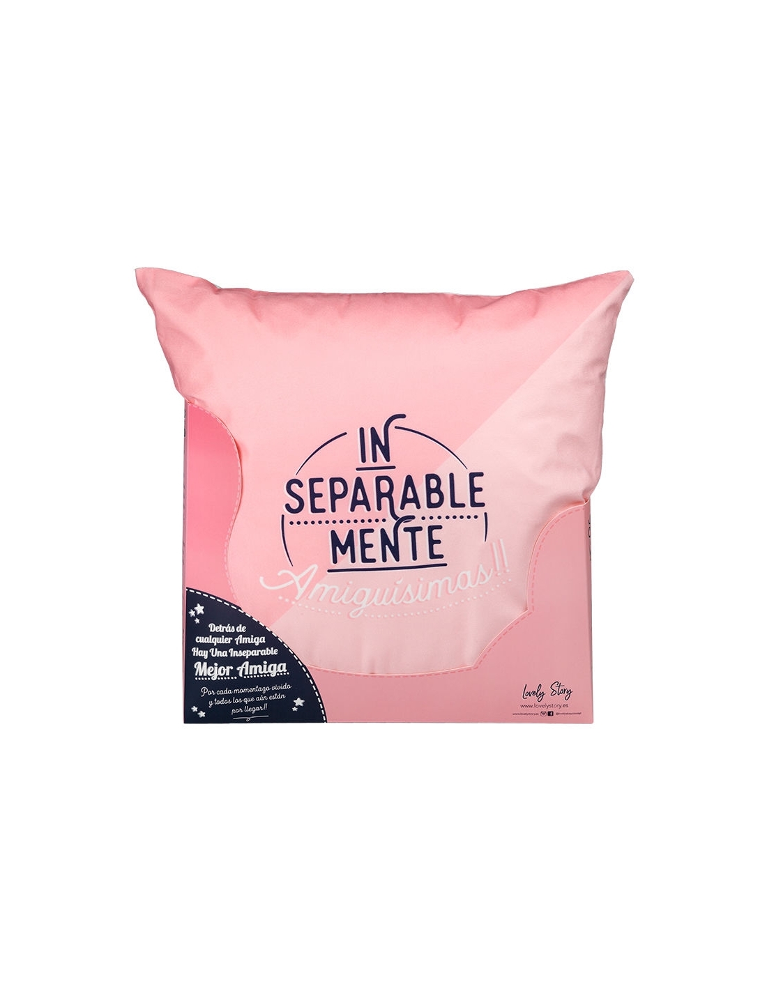 Cojín con mensaje decorado a doble cara presentado en caja expositora de 45x45cm. Con la frase: inseparablemente amiguísimas .